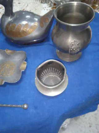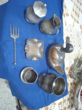 Set di oggetti decorativi in peltro dal design classico. Include una caffettiera, una piccola caraffa, un forchettone, un piatto decorativo, un contenitore a forma di anatra e un bicchiere. Pezzi con dettagli ornamentali.
