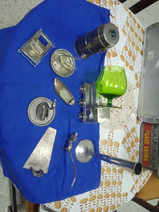 Raccolta di vari oggetti decorativi in stile vintage. - Pezzi in metallo argentato. - Include un bicchiere verde. - Elementi con design vari.