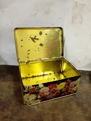 Scatola metallica vintage con un grazioso motivo floreale. Misure: 10x22x15. Di Cola Cao. - Design floreale colorato su coperchio e lati. - Ideale per conservare piccoli oggetti o come elemento decorativo.