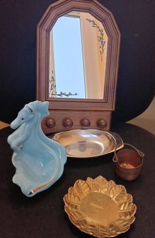 Lotto 5 oggetti Vintage ani 60’ composto da: un posacenere in ceramica a forma di cavallo (presenta alcune scheggiature sul bordo), uno specchio porta chiavi in legno, un piattino in ottone massiccio d’orato, un paiolo giocattolo in rame, un vassoio giocattolo in metallo. Tutto in ottime condizioni.