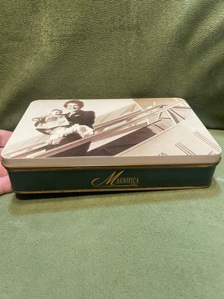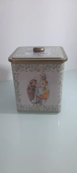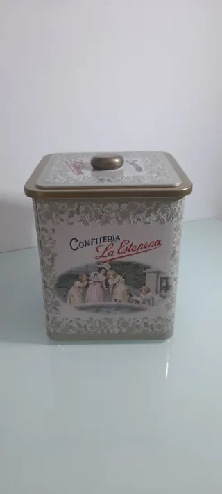 Bella scatola di latta con un design vintage della Confetteria La Estepena. Ideale per collezionisti o per conservare piccoli oggetti. - Design con scena d'epoca. - Bordo decorativo floreale. - Coperchio dorato. - Alta 14 cm e quadrata 12,5x12,5 cm. La scatola propriamente detta misura 11,5x11,5 cm. Come nella foto.