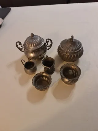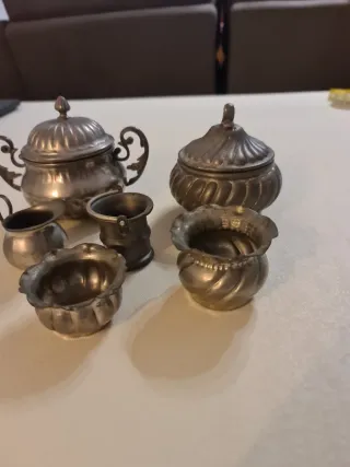 Lotto di sei oggetti in peltro vintage, ideali per collezionisti o per aggiungere un tocco d'epoca alla vostra casa. - Set composto da zuccheriere, due ciotoline e due contenitori. - Materiale: peltro. - Stile: vintage.