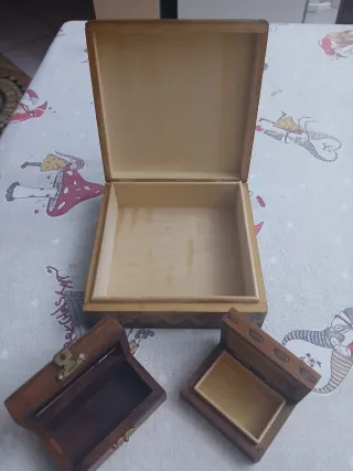 Set di tre scatoline decorative in legno, perfette per conservare piccoli oggetti o come elementi d'arredo. - Scatola grande con decorazioni intarsiate e colorate. - Scatola media in legno con inserti in ottone. - Scatolina legno lavorazione a mano.