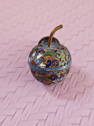 Deliziosa mini scatola in stile orientale, perfetta come soprammobile o per custodire piccoli oggetti. - Design a forma di mela. - Decorazioni floreali cloisonné. - Include un elegante supporto in legno scuro. - Dimensioni: altezza 5,5 cm e larghezza 2 cm.