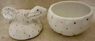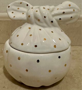 Graziosa scatola vintage in ceramica, decorata con pois dorati. Perfetta per conservare piccoli oggetti o come elemento decorativo. - Design a forma di sacchetto con fiocco. - Finitura lucida bianca con pois dorati. Scatola vintage ceramica a forma di fagotto con pois dorati con marchio del produttore sul fondo. La scatola è nuova e si trova in ottimo stato. Ha altezza Max 13 cm e diametro 10 cm. Sarà accuratamente imballata e spedita.