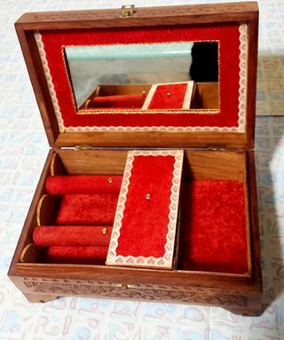Elegante scatola portagioie in legno con intarsi decorativi. Perfetta per conservare i tuoi gioielli. - Interno rivestito in velluto rosso. - Specchio integrato nel coperchio. - Scomparti interni per organizzare gli oggetti.