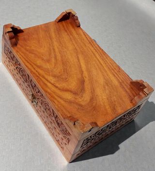 Piccola scatola in legno con un design decorativo sul coperchio. Ideale per conservare piccoli oggetti. Materiale: legno. Design: coperchio con cornice rettangolare e dettagli ornamentali. Le foto sono parte della descrizione del prodotto.