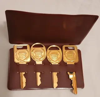 vintage Cadillac per collezionista 4 chiavi d'oro 24k. Con astuccio in vinile , ogni chiave ha il design della stemma di cadillac sulla testa La chiave quadrata e per l' asccensione ( primaria). La chiave ovale ( secondaria) e per le portiere / vano porta oggetti e stanpamta sul gambo "H" Astuccio colore bordo in vinile exteriore design stemma cadillac su la copertina , retro esterna e contrasegnato con il numero 1643434 Che represanta astuccio elegante che un collezionista non puoi manncarle. Astuccio:Alto: 6cm.---larga : 9:5cm.