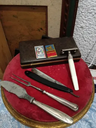 Set di oggetti vintage vari. - Navaja de barbero. - Maquinilla de afeitar. - Cubiertos in metallo, uno a forma di coltello e l'altro a forma di forchetta, lame e scatola vuota per guillette rezor II prezzo per tutto. Come nelle foto, che sono parte importante della descrizione.