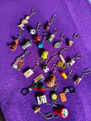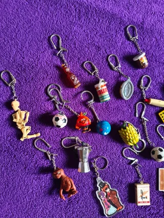 Collezione di portachiavi vintage con vari design. Include figure, oggetti e motivi diversi. Ideale per collezionisti o per dare un tocco retrò. Ogni portachiavi ha un design unico. Si accettano offerte