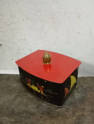 Bella scatola di ferro con un design vintage e decorativo. Ideale per conservare piccoli oggetti o come pezzo da collezione. Con difetti. Misure: 7,5x10x8. - Coperchio rosso con ornamento dorato. - Lati neri con scena di carrozza e animali. - Iscrizione sulla base.