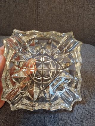 Posacenere Vintage in Vetro Lavorato Rétro anni '70 Dimensioni: 14 x 14 x 5 cm Splendido posacenere vintage in vetro pesante trasparente, caratterizzato da una raffinata lavorazione geometrica a rilievo e bordi irregolari "effetto ghiaccio". Questo pezzo non è solo un oggetto funzionale, ma un vero elemento di design come complemento d'arredo su un coffee table in stile Mid-Century. Materiale: Vetro pressato di alto spessore. Stile: Vintage anni '60/'70. Forma: Quadrata con base decorata a stella/diamante. Perfetto per chi ama il modernariato e gli oggetti in vetro che giocano con i riflessi della luce.
