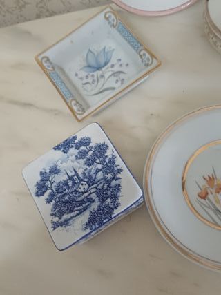 Set di 6 oggetti d'arredo vintage, tutti pezzi firmati. Ideali per collezionisti o per aggiungere un tocco di eleganza alla casa. - Piatto decorativo con fiori rosa e bordo rosa. - Scatola rotonda in ceramica con scena dipinta e manici. - Coperchio rotondo con decorazione di uccello su sfondo blu. - Piatto bianco con fiori e fogliame dorati, etichetta 24KT GOLD. - Piccolo vassoio rettangolare con decorazione floreale blu. - Scatola quadrata con decorazione blu e bianca in stile chinoiserie.