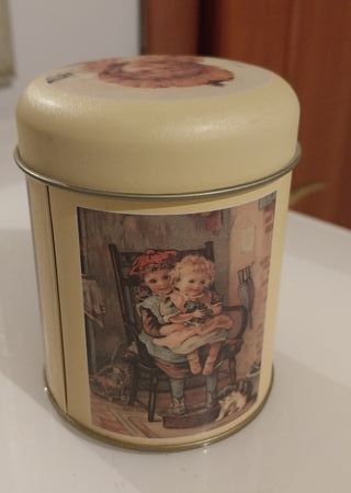 Scatola in latta decorata con personaggi olandesi Ot en Sien.Ppersonaggi olandesi Ot en Sien. La scatola è realizzata in latta (metallo stagnato) ed ha una forma cilindrica con coperchio. Diametro 7,5 cm, alta 9,5 cm (n.3102) - Design vintage con illustrazione. - Ideale per conservare piccoli oggetti.