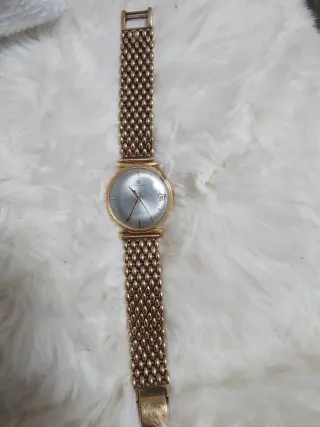 Elegante orologio da polso Eterna Matic con cinturino dorato. - Quadrante argentato. - Cinturino a maglia dorato. - Finestra per la data.