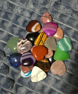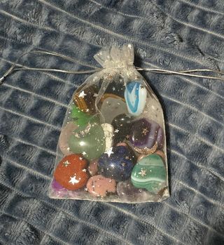 26 piedras auténticas para cristaloterapia y equilibrio de chakras, incluyendo ojo de tigre, lapislázuli, amatista, obsidiana, cristal de roca, cuarzo y muchas más. Las vendo a menos de 2 € cada una (usted pagó 5 € cada una). Precio por el conjunto completo, incluyendo una bolsita de plata. Para más información o fotos, por favor, pregunte :)