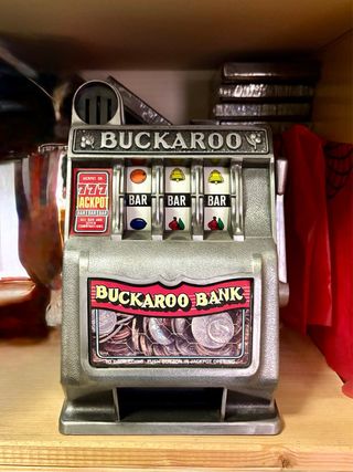 Simpatico salvadanaio a forma di slot machine Buckaroo Bank. - Design a tema western. - Dettagli colorati con simboli classici delle slot. - Apertura per le monete sul jackpot opening. - No Battery. - Suona quando vinci! #buckaroo #buckaroogame #salvadanaio #giochi #slot #machine