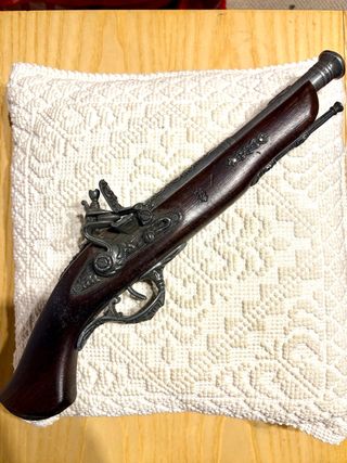 Pistola decorativa di stile italiano antico, con finiture dettagliate. - Manico in legno scuro. - Dettagli in metallo anticato.