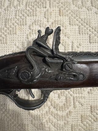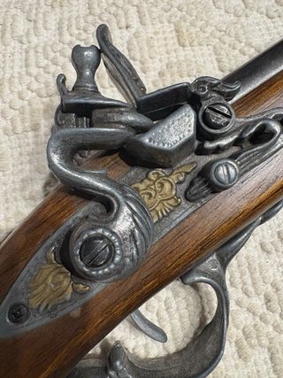 Pistola decorativa di epoca, stile XVII secolo. Realizzata in legno, meccanismo a pietra focaia in metallo brunito, canna stretta anch’essa in metallo brunito, nel calcio viene applicata una placca raffigurante fregi dell’epoca. - Finiture in legno e metallo. - Dettagli decorativi elaborati.