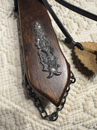 Fionda artigianale in stile medievale, realizzata con cura. - Struttura in legno robusto. - Dettagli in metallo lavorato. - Elastici in gomma nera. - Impugnatura decorata con inserti metallici.