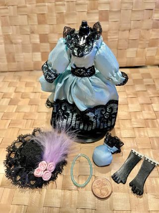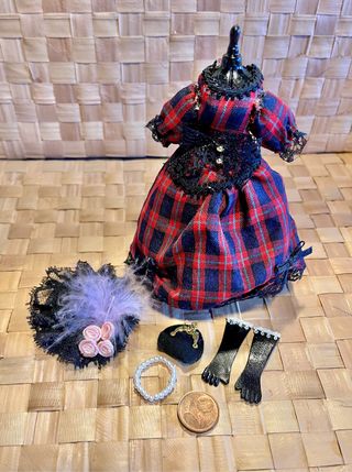Lotto componenti sartoria o negozio Doll’s House composto da: manichino con vestito, borsettina a sacchetto, collana, guanti e cappello. Altezza manichino 11,5 cm. Componenti indispensabili per completare la vostra casa di bambole o la vostra room box