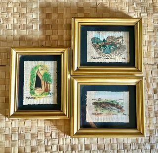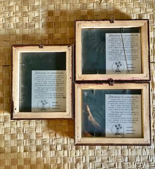 Lotto tre quadretti vintage con immagini di tre siti archeologici della città di Siracusa stampati su papiro lavorato a mano ed acquarellato. Le cornici sono in legno dorato è nel retro è inserito il certificato di garanzia. Quadretti veramente molto belli che arredano qualsiasi ambiente. Le dimensioni di ogni quadretto sono 17 × 14 cm. Non separo il lotto.