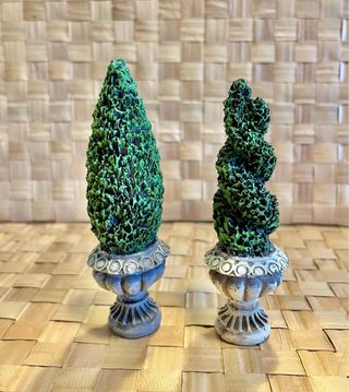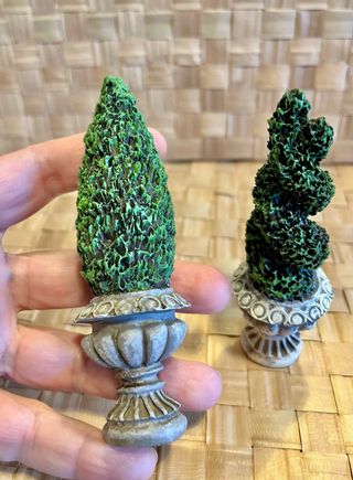 Coppia vasi con arbusti decorativi per giardino di Dolls House. Fabbricati in resina che imita la pietra e le piante. Vasi con altezza totale di 11 cm perfettamente in scala per le Dolls House. In perfetto stile vittoriano non può mancare nel giardino della vostra Doll House.