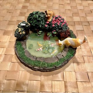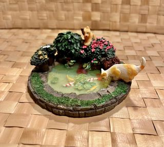 Grazioso bacino d'acqua decorativo per casa delle bambole, completo di gatti e pesci. - Dettagli realistici di piante acquatiche e pesci koi. - Due gatti in miniatura, uno che beve e uno che osserva. - Base decorata con pietre e vegetazione. - Diametro 12 cm