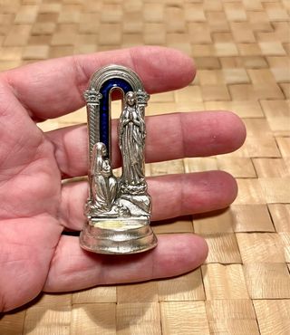 Adorazione della Madonna in metallo argentato anticato e smaltato in blu in stile rinascimentale. Perfetta per decorare il salotto della vostra Doll’s House. Altezza totale di 6,3 x 2,7 cm perfettamente in scala per le Doll’s House.