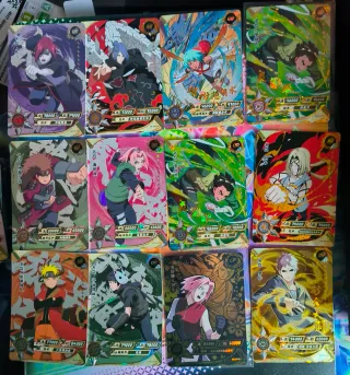 Set di carte collezionabili del mondo di Naruto, marca Kayou. Le carte presentano illustrazioni dettagliate dei personaggi. - Carte con finitura olografica. - Numeri di serie visibili sulle carte.