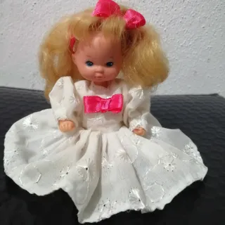 Bambola Barbie Bebè vintage, parte della collezione Heart Family, prodotta a Taiwan. - Capelli biondi raccolti con fiocchi fucsia. - Vestito bianco con dettagli ricamati e fiocco fucsia sul petto. - Occhi azzurri e espressione dolce.