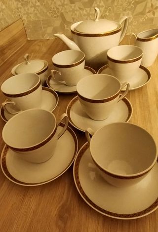 Elegante servizio da caffè o tè in porcellana di Chodziez, Made in Poland. Un set raffinato per ogni occasione. - Decorazioni dorate sui bordi. - Include teiera, zuccheriera, lattiera e diverse tazze con piattini.