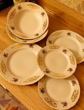 Elegante servizio di piatti in ceramica con decorazioni floreali e dorate, proveniente dalla Cecoslovacchia. - Design classico con bordo ondulato. - Motivi floreali colorati. - Dettagli in oro. - Materiale: Ceramica.