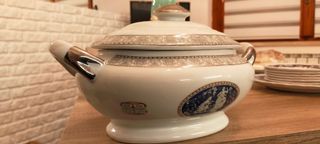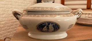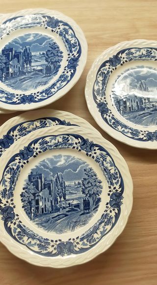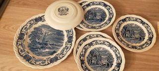Set di piatti in ceramica con decorazione blu e bianca. - Marchio: WH Grindley & Co. Ltd. - Design: Paesaggio campestre con architetture. - Bordo decorato a rilievo.