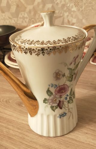 Elegante servizio da caffè in porcellana CT, decorato con delicati fiori colorati e bordi dorati. - Include teiera, zuccheriera, lattiera, 6 tazzine e 6 piattini. - Design floreale classico.