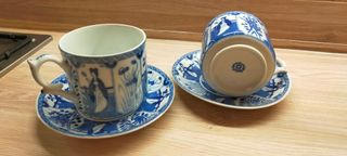 Set di due tazze da tè in porcellana con decorazioni orientali. - Design con figure e motivi floreali. - Colore blu e bianco.