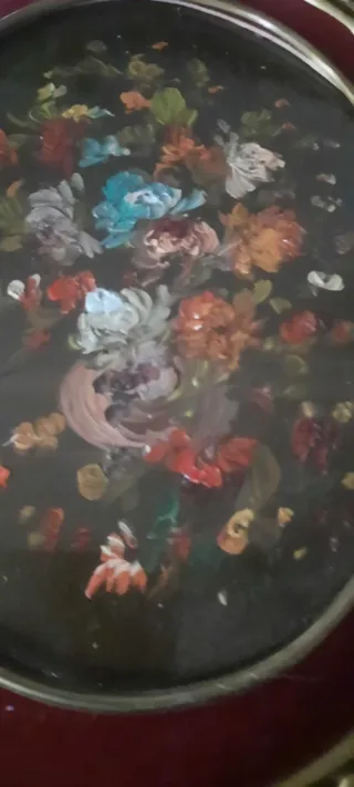 Un bellissimo quadro ovale dipinto ad olio. Misure 33x24 - Cornice decorata in metallo. - Sfondo scuro con un vaso di fiori colorati.
