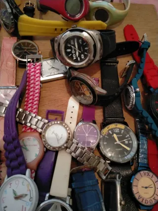 Lotteria di orologi di diversi stili e marche. - Orologi analogici e digitali. - Design sportivi e casual. - Cinturini in metallo, plastica e tessuto. - Varietà di colori e dimensioni. Alcuni funzionano, altri no.