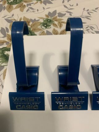 Set di supporti per esporre orologi Casio. Design in blu. Iscrizione WRIST TECHNOLOGY CASIO in argento. Ho 17 unità, le offro tutte per 35€.