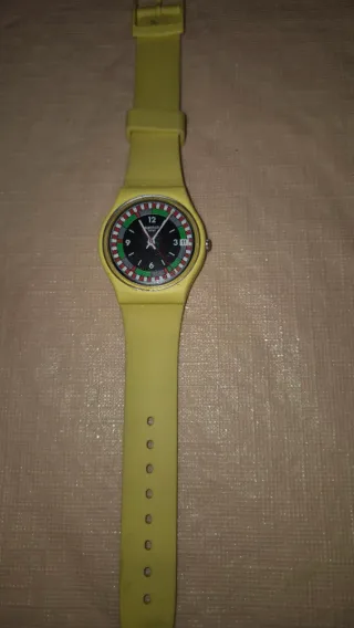 Orologio Swatch Neon con design accattivante e multifunzionale. - Quadrante multicolore con dettagli in giallo, blu e arancione. - Lunetta esterna rosa. - Cinturino nero in tessuto. - Chiusura con fibbia e dettaglio giallo. - Funzioni di cronografo. Bisogna cambiare la pila e non ho la scatola. Impeccabile.