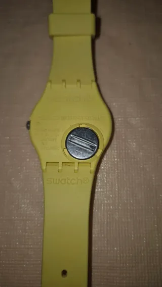 Orologio Swatch con cinturino in metallo. Design moderno con maglie. Quadrante argentato con dettagli. Chiusura di sicurezza. Presenta un graffio nella parte superiore dello schermo.