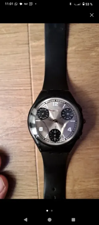 Orologio Swatch Cronometro Skin in colore nero. - Quadrante argentato con dettagli in nero. - Cinturino in silicone nero. - Tre sotto-quadranti nel quadrante principale. - Funziona perfettamente.