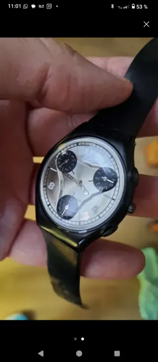 Acquistato nell'ottobre 2025 presso la Boutique Swatch di Serrano, modello esclusivo della Boutique. Messaggio nascosto visibile solo sotto luce ultravioletta. Indossato una volta per provarlo con il cinturino NATO luminescente. Cinturino originale mai usato. Fornito con tutta la dotazione e il biglietto d'acquisto. Materiale della cassa: Bioceramic. Diametro della cassa: 42,00 mm. Spessore della cassa: 13,75 mm. Movimento al quarzo: cronografo con indicatore delle fasi lunari. Resistenza all'acqua: 3 bar. Cinturino: VELCRO® e NATO Zuludiver luminescente.