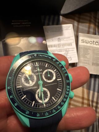 Orologio Swatch Moonswatch della collezione Polar Lights, set completo con garanzia fino a novembre, plexi con una linea quasi impercettibile, da qui il prezzo. Modello: Mission on Earth. Materiale: Bioceramic. Colore: Verde azzurro e blu marino. Include cinturino originale e un altro in gomma specifico per quell'orologio con chiusura pieghevole di sicurezza. Swatch, moonswatch, seiko, citizen, orient, omega...