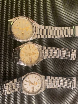 Tre orologi da polso automatici da uomo, marca Orient. - Cassa e bracciale in acciaio inossidabile. - Quadrante color oro/bianco. - Datario giorno/data.