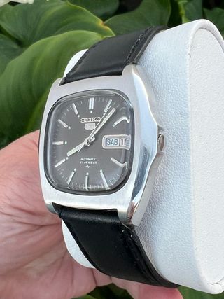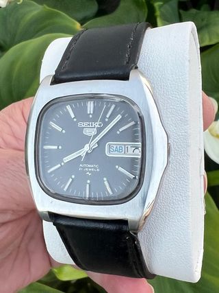Orologio Seiko 5 automatico da uomo con cinturino in pelle nera. - Quadrante nero. - Indicatore di giorno e data. - Movimento automatico 7019 a 21 rubini. - Cassa in acciaio da 38mm. - Produzione ottobre 1974.