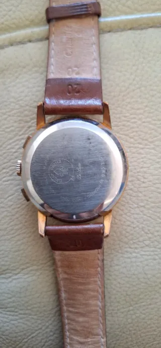 Orologio cronografo Cauny Prima da uomo. Un classico con un design elegante. Prodotto nel 1959. Movimento Landeron Calibre 248. Placcato in oro (10 micron). - Quadrante bianco con dettagli dorati. - Cinturino in pelle marrone. - Funzioni di cronografo.
