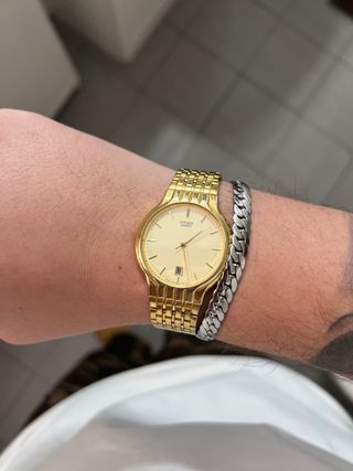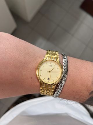 Elegante orologio Citizen Quartz da uomo con finitura dorata. Un accessorio classico e sofisticato. - Quadrante color crema. - Cinturino a maglie dorate. - Finestra della data. Funziona perfettamente con batteria nuova.