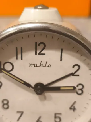 Sveglia meccanica da tavolo marca Ruhla, con un design classico e intramontabile diametro 7,5 cm perfettamente funzionante - Quadrante bianco con numeri neri. - Lancette nere e gialla. - Cassa in metallo. - Made in GDR inciso sul quadrante.