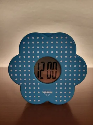 Sveglia digitale a forma di fiore azzurro con pois bianchi. - Display LCD. - Design a forma di fiore. - Colore azzurro con pois bianchi. - Logo VIRTIME sul fronte. - Proiettaluce